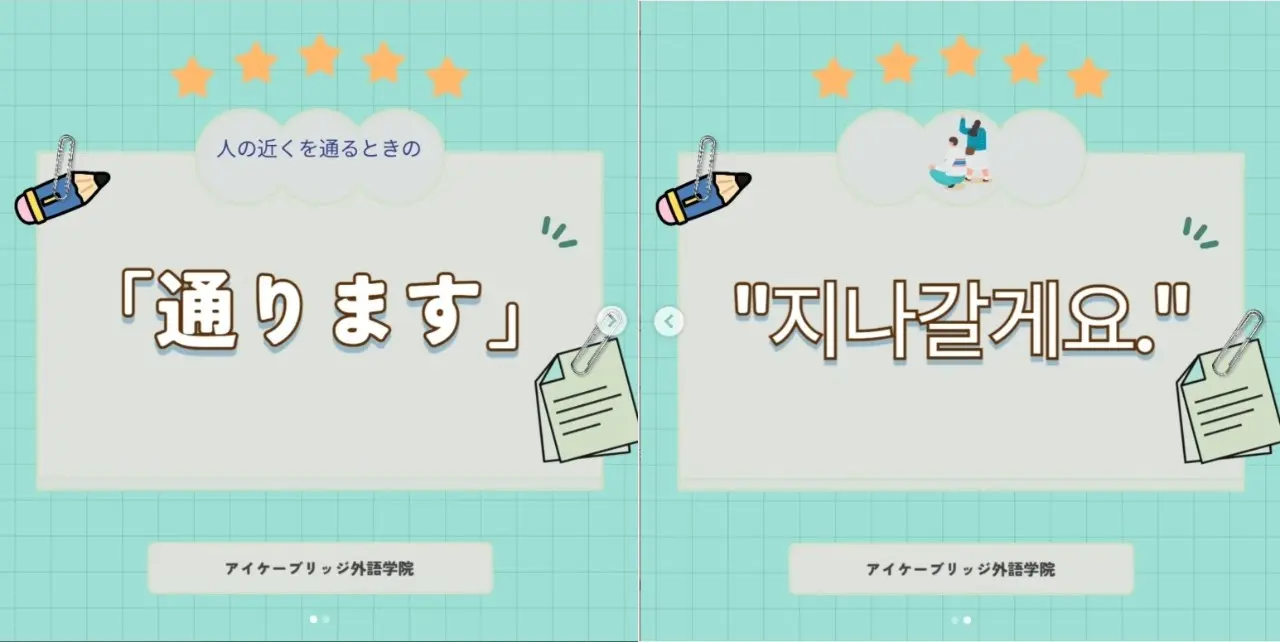 狭い空間で人にぶつからないように通ったり、自分が通ることを知らないでいる人に知らせるとき使う韓国語は「지나갈게요」です。