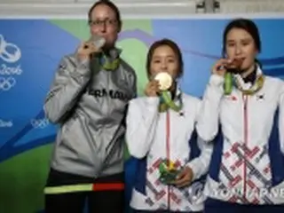 金メダルの張恵珍(中央)と銅メダルの奇甫倍(右)=11日、リオデジャネイロ(聯合ニュース)