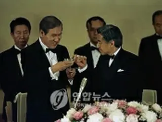 90年5月に訪日した盧泰愚大統領(左から2人目)と乾杯する明仁天皇(現上皇、資料写真)=(聯合ニュース)≪転載・転用禁止≫