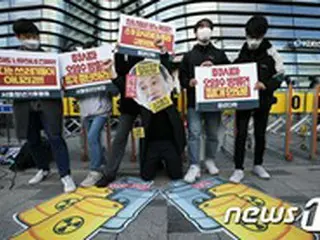 ソウル・日本大使館前で福島第1原発処理水の放出決定に対する糾弾会見をする青年団体。(画像提供:wowkorea)