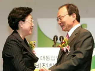 手を取り合う韓明淑氏(左)と李海チャン氏=14日、ソウル(聯合)