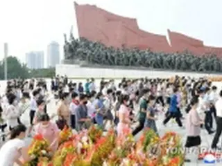 北朝鮮の金日成主席の死去から27年を迎えた2021年7月8日、金主席、金正日(キム・ジョンイル)総書記の銅像を参拝する平壌市民=(朝鮮中央通信=聯合ニュース)≪転載・転用禁止≫