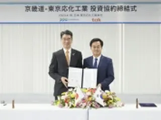 18日に投資協約を締結した京畿道の金東ヨン知事(右)と東京応化工業の種市順昭社長(京畿道提供)=(聯合ニュース)≪転載・転用禁止≫