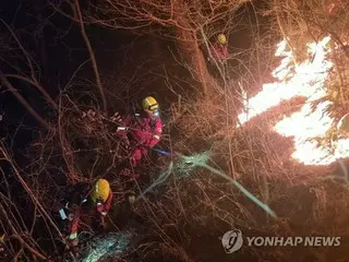 夜間も消火活動を続ける消防隊員(山林庁提供)=(聯合ニュース)≪転載・転用禁止≫