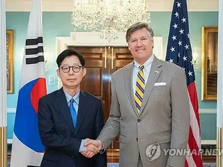 握手を交わす韓国外交部の朴潤柱第1次官(左)とクリストファー・ランドー米国務副長官(外交部提供)=1日、ワシントン(聯合ニュース)≪転載・転用禁止≫