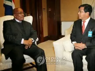 インタビューに応じるズマ大統領(左)。右側は朴ジョン讃(パク・ジョンチャン)社長=17日、ヨハネスブルク(聯合ニュース)