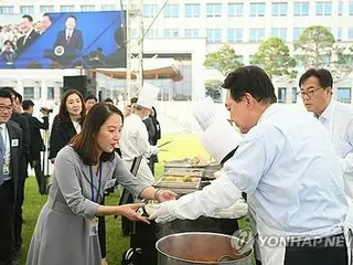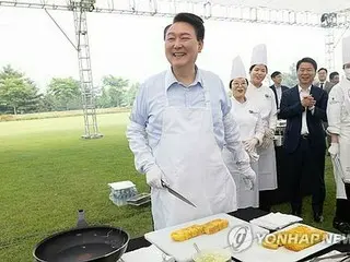 【ソウル聯合ニュース】2022年5月の就任から3年目を迎え意思疎通の強化に乗り出した韓国の尹錫悦(ユン・ソクヨル)大統領が24日、報道関係者約200人を招いてソウルの大統領室庁舎前の広場で夕食会を開き、自ら肉を焼いてキムチチゲを配った。