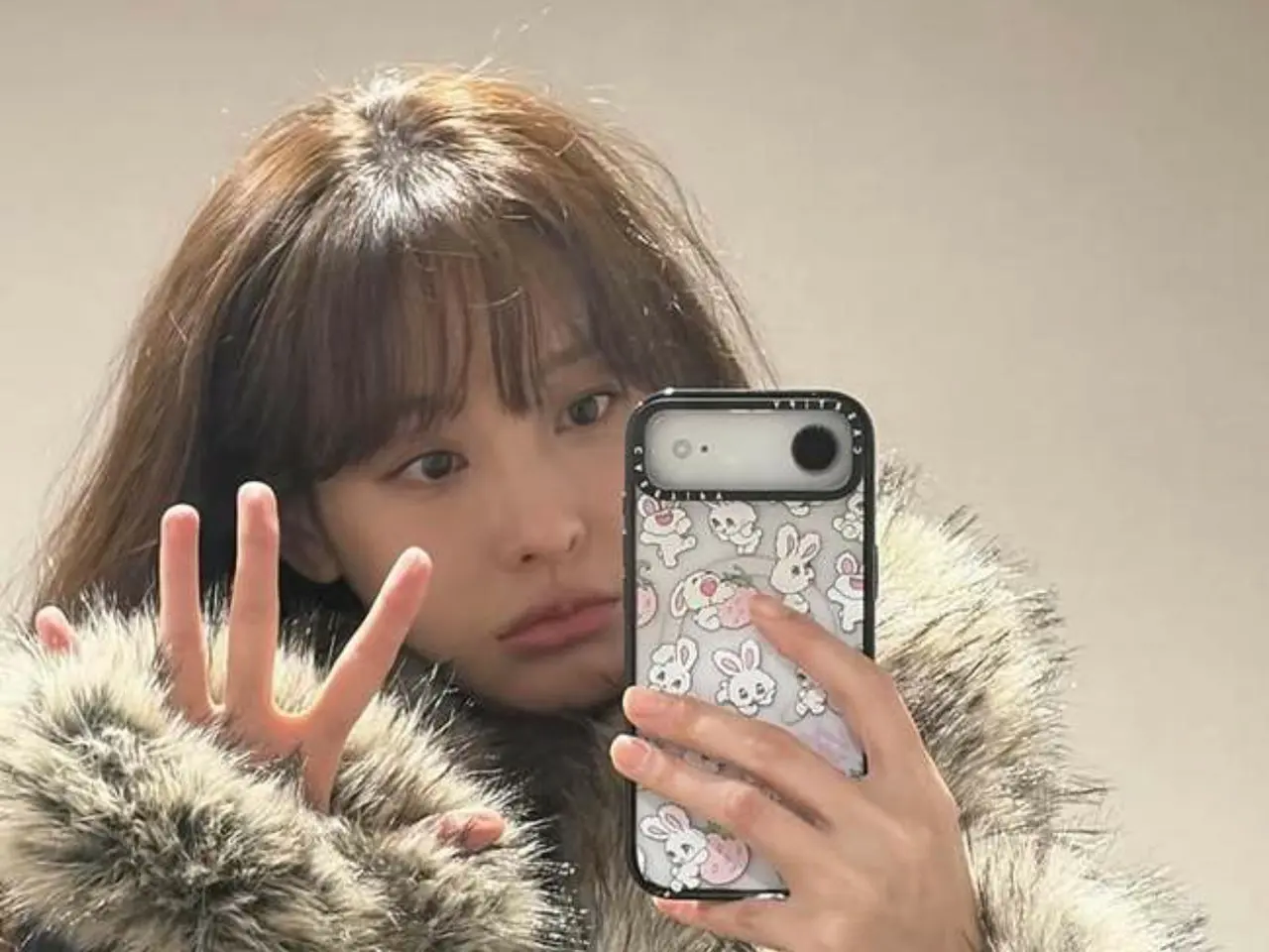 彼女の手に握られた携帯ケースも視線を引き、多様なウサギのキャラクターが描かれています。 1987年生まれのオ・ヨンソは38歳であるにもかかわらずクアンク(着飾ったような着飾ってないような)の自然な雰囲気を演出しています。