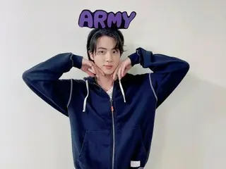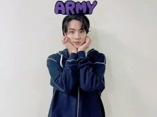 写真には、ネイビーのフードジップアップを着たジンがポーズを取る姿が写っています。ジンは紫色の「ARMY」という文字のカチューシャをして両手を頬に当ててキュートなポーズを取っています。ファンに対する愛情にあふれたジンの姿が見る人を微笑ませています。