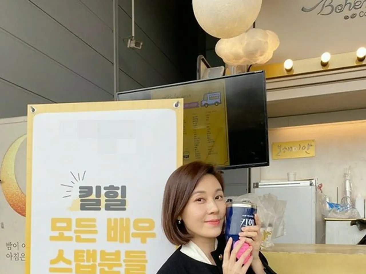 今回公開された写真には、tvN水木ドラマ「キルヒール」撮影現場に設けられたカフェカーの前でポーズをとっているキム・ハヌルの姿が収められています。