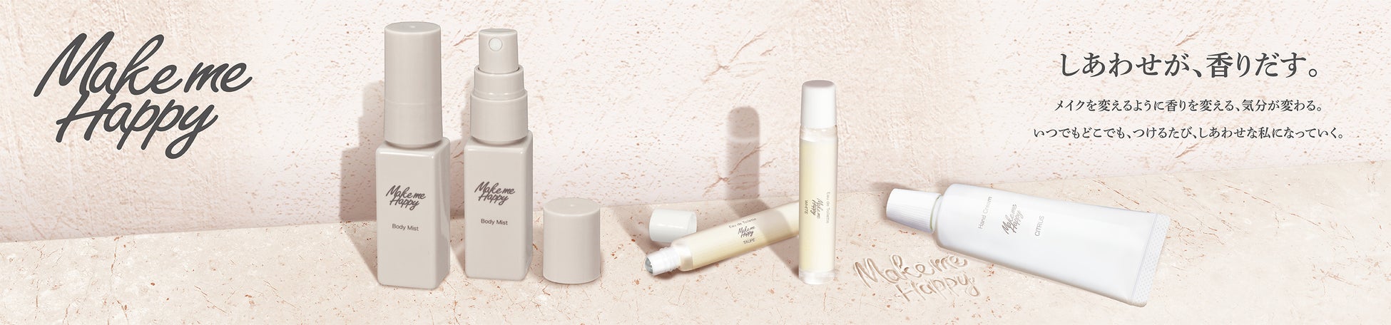 “私をハッピーにする香り”をコンセプトに 「メイクを楽しむように、香りを楽しんでほしい」との願いを込めて、 やさしい香りを楽しむフレグランスアイテムをお届けしています。